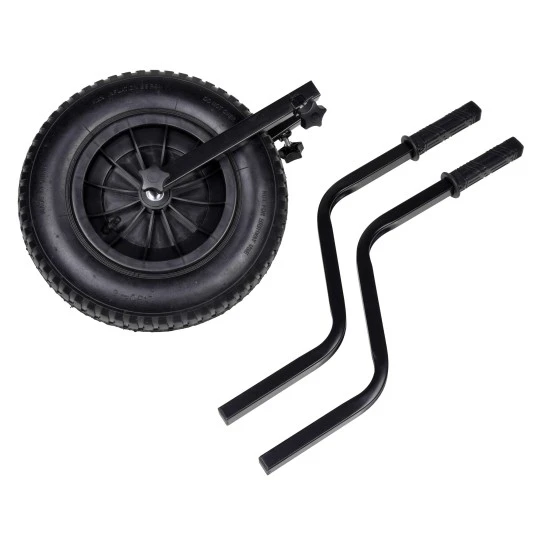 het barrow system bestaat uit een grote lucht band (36cm doorsnee) en 2 robuuste hendels in de juiste lengte, voorzien van rubberen handvaten. het geheel is perfect in balans en gemakkelijk te sturen, zodat een wandeling over hobbelige of zachte ondergronden geen enkel probleem vormt. De meegeleverde metalen aastafel biedt in horizontale positie plaats aan tal van accessoires en aassoorten. Geplaatst in verticale positie vormt deze aastafel een opstaande rand waartegen een tas of andere spullen geplaatst kunnen worden voor veilig transport.
