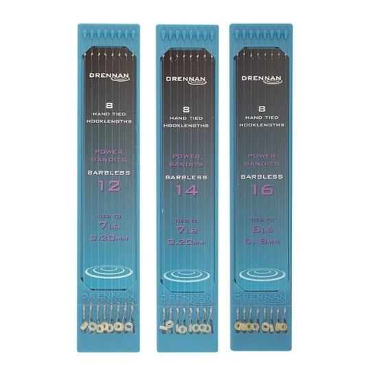 De Drennan Hookplate 6” Power Bandits zijn kant-en-klare vaste hengel onderlijnen met een lengte van 15cm. en speciaal ontwikkeld voor het vissen op commercials. De Carp Hair Rigger haak is bronskleurig, heeft een naar achteren gepositioneerd oog waardoor de haak recht op de lijn zit en de presentatie van het haakaas sterkt wordt verbeterd. De onderlijn is voorzien van een baitband welke geschikt is voor het presenteren van een pellet. De onderlijnen zijn gemonteerd op een zogenaamde “hookplate system”, dit display systeem houdt de onderlijk en lussen in één rechte lijn. Hierdoor worden kinken en beschadigingen van de nylon lijn voorkomen. Door dit systeem blijft elke onderlijn altijd om een rechte lijn onder lichte spanning opgeborgen. Elke onderlijn is zeer nauwkeurig geknoopt en voorzien van een zeer precieze gelegde bledknoop.